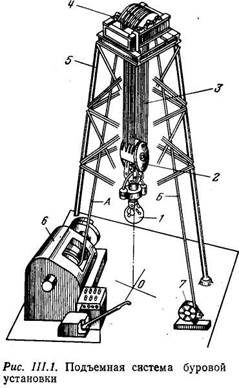 Подъемная система установки (рис. III.1) представляет собой полиспастный механизм, состоящий из кронблока 4, талевого (подвижного) блока 2, стального каната 3, являющегося гибкой связью между буровой лебедкой 6 и механизмом 7 крепления неподвижного конца каната. Кронблок 4 устанавливается на верхней площадке буровой вышки 5. Подвижный конец А каната 3 крепится к барабану лебедки 6, а неподвижный конец Б — через приспособление 7 к основанию вышки. К талевому блоку присоединяется крюк 1 , на котором подвешивается на штропах элеватор для труб или вертлюг. В настоящее время талевый блок и подъемный крюк во многих случаях объединяют в один механизм — крюкоблок.