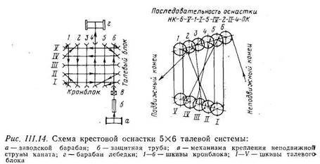 Существует два типа оснасток: параллельная, когда ось талевого блока параллельна оси кронблока, и крестовая, когда оси талевого блока и кронблока перпендикулярны. Наиболее распространена крестовая оснастка (рис. III.14). Она имеет то преимущество, что исключает закручивание талевого блока и трение струн каната друг о друга.