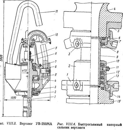 Напорный сальник 11 во время роторного бурения эксплуатируется в тяжелых условиях, срок его службы (50—100 ч) во много раз меньше, чем остальных деталей вертлюга, поэтому он выполняется быстросменным. В верхней и нижней частях корпуса вертлюга для уплотнения зазора между корпусом и вращающимся стволом устанавливают самоуплотняющиеся манжетные сальники 2 и 8, которые предохраняют от вытекания масла из корпуса и попадания в него снаружи влаги и грязи.