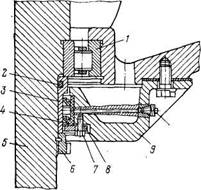 Горизонтальный приводной вал 6 выполняется обычно в виде отдельной сборки, в которой вал с ведущей конической шестерней, насаженной на нем, монтируется на роликоподшипниках во втулке. Сдвоенный радиально-упорный подшипник, воспринимающий радиальные и осевые нагрузки от зубчатой передачи, устанавливается рядом с конической шестерней. Вторая опора вала — цилиндрический роликоподшипник. На внешнем конце вала монтируется либо цепная звездочка 9 при приводе ротора цепной передачей от лебедки, либо шарнир карданного вала.