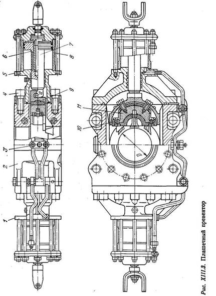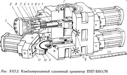 Превентор, выпускаемый ВЗБТ (рис. ХШ.2) состоит из стального литого корпуса 7, к которому на шпильках крепятся крышки / четырех гидравлических цилиндров 2.