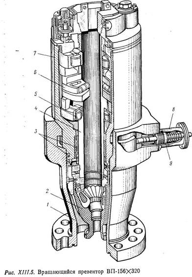 Основной элемент вращающегося превентора (рис. ХШ.5) — уплотнитель 2, позволяющий протаскивать инструмент через его отверстие. Уплотнитель состоит из металлического основания и резиновой части, прикреплен к стволу 4 при помощи байонетного соединения и болтов. От проворачивания его предохраняют шпоночные выступы, входящие в вырезы ствола.