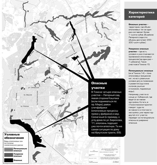 На территории города Томска выделяется 33 участка, опасных и потенциально опасных в оползневом отношении. Наиболее опасными является Лагерный Сад, микрорайоны "Солнечный" и "Каштак", левый борт р. М. Киргизка (район восточнее ж/д ветки на г.Северск) [11].