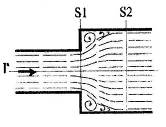 При внезапном сужении потери обусловлены, во-первых, трением потока при входе в трубу меньшего диаметра и, во-вторых, потерями на вихреобразование. Последние обусловлены тем, что на частицы жидкости, движущейся по криволинейным траекториям, действуют силы, направленные к оси струи. Двигаясь под действием этих сил, частицы жидкости не обтекают входной угол, а срываются с него, что приводит к сужению потока на участке трубопровода меньшего диаметра. Кольцевое пространство, образованное сжатым потоком и стенками трубы, заполняется завихренной жидкостью.