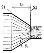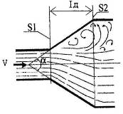 При достаточно больших углах сужения (α > 10о) степенях сужения (n > 3) на входе в цилиндрическую трубу меньшего диаметра поток может оторваться от стенок (рис. 5) и в этом случае коэффициент сопротивления конфузора представляется в виде двух слагаемых: