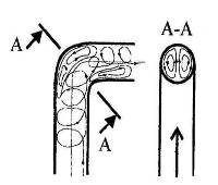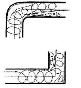 У внешней стенки, вследствие повышения давления, появляется диффузорный эффект. При этом отрыв потока происходит от обеих стенок. Отрыв от внешней стенки является следствием диффузорного эффекта. Отрыв от внутренней стенки обуславливается стремлением потока двигаться в изогнутом участке по инерции к внешней стенке.