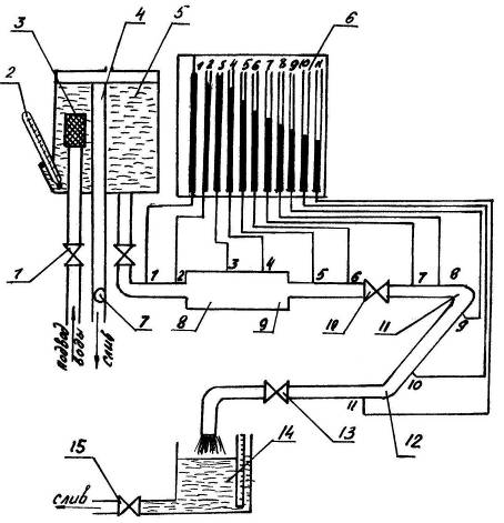 Установка снабжена пьезометрическим щитом 6 для замера напоров во всех наблюдаемых сечениях, как показано на рис. 8