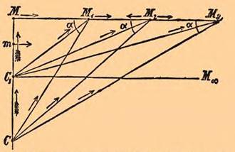 Рис. 1 − Различные углы выхода ударов землетрясения. М, М1 , М2 , М3 – поверхность земли. С, С1 , m – исходные пункты подземных ударов.