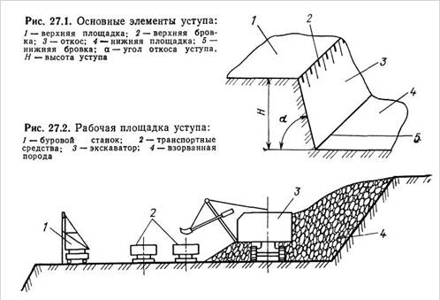 Основными элементами уступа являются: верхняя и нижняя площадки, откос, угол откоса бровки уступа и забой уступа (рис. 27.1). Верхняя горизонтальная часть поверхности уступа называется верхней площадкой, а нижняя — нижней площадкой.