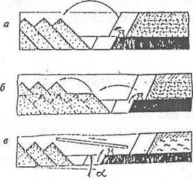 При системе разработки с перевозкой во внутренние отвалы (рис. 6.19, а) порода перемещается на сравнительно короткое расстояние по пути с благоприятным профилем, обычно без подъема в грузовом направлении. Система с перевозкой породы на внешние отвалы (рис. 6.19, 6) характеризуется перемещением вскрыши на значительные расстояния: 2—4 км для автотранспорта и до 10 км для железнодорожного транспорта.Порода перемещается на пути с подъемом в грузовом направлении. Система с перевозкой породы частично на внутренние и частично на внешние отвалы (рис. 6.19, в) имеет признаки первых двух систем этой группы.