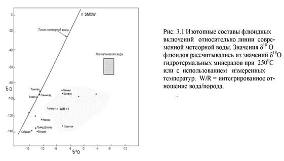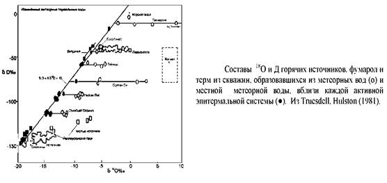 Гидротермы, ответственные за низкосерную эпитермальную минерализацию, преимущественно метеорные, несмотря на то, что предполагаемым источником тепла, генерирующим гидротермальную конвекцию, в большинстве случаев является магма. Этот вывод основывается, главным образом, на содержаниях кислорода - 18 и дейтерия в эпитермальных флюидах. Значения 5Д1 обычно определяется прямым анализом флюидных включений, тогда как 518 О определяется по анализам кристаллов кварца и кальцита, предполагая, что один из них имеет независимый геотермометр. Изотопный состав флюидов некоторых эпитермальных месторождений, рассчитанный по изотопному составу гидротермальных минералов, был использован С Neil, Silbermanи показан на рис. Для сравнения, изотопный состав гидротерм и местной метеорной воды некоторых Новозеландских геотермальных систем показан на рис.