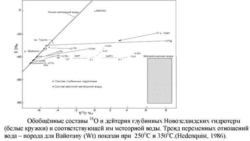 Рисунок показывает, что большинство низкосернистых геотермальных систем в мире имеют преимущественно циркуляцию метеорных вод. Наоборот магматические флюиды сильно отличаются по изотопному составу от метеорных гидрогеологических систем. Это будет обсуждаться более детально при изучении минерализации высокосернистых систем.