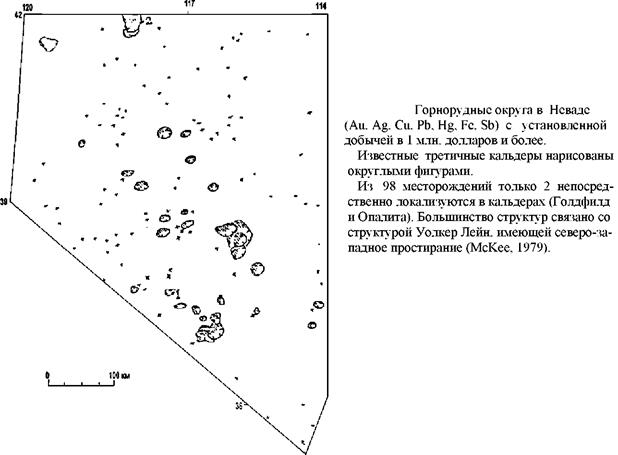 Рисунок показывает 5 км ширины полосу, охватывающую изолинию +8 %% 518О, которая оконтуривает большинство эпитермальных и мезотермальных шахт благородных металлов в этом районе. Минерализация в этом случае не связана с районом наиболее низких 518О и фронтом гидротерм. Скорее всего этот район располагается вне кальдерно кольцевой зоны разломов, где имелся небольшой градиент в отношении вода / порода, который наилучшим образом способствовал минерализации.