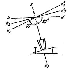 Повернем алидаду на 180° вокруг оси zz 1 ; тогда ось уровня займет положение и1 и´ 1 , т.е. отклонится от правильного положения и2 и´2 на тот же угол, но в противоположную сторону. Изменение наклона оси уровня, которое может быть выражено разностью отсчетов по уровню при двух его положениях, даст удвоенное значение угла между правильным положением уровня и2 и´2 и неправильным ии' (или u 1 u ´1 ,). Следовательно, для устранения рассматриваемой неперпендикулярности ось уровня относительно оси zz 1 следует изменить (наклонить) на половину угла, соответствующего упомянутой разности отсчетов по уровню.