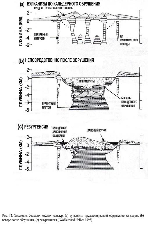 Многочисленные общие модели и разрезы риолитовых кальдерных комплексов были представлены в литературе (рис. 11, 12, 13). Фациальные модели (рис.14) были разработаны Cas, Wright, (1988).