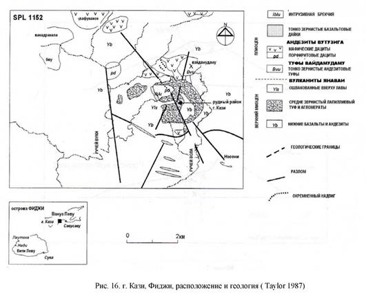 Медная и золотая минерализация в островных дугах не ограничивается андезитовыми стратовулканами и риолитовыми кальдерными комплексами. Комплексы дацитовых лавовых куполов также содержат эпитермальные месторождения, как, например, медно-золотое эпитермальное месторождение хай-сульфидейшн в Чанкайши на Тайване (рис. 26). Модели вулканических фаций мене пригодны для этого типа эруптивных центров по двум причинам. Они меньше по площади, менее систематические изменения в литологии, чтобы можно выделить фации и они имеют меньшие мощности, так что рудная минерализация частично происходила а подстилающих до вулканических образованиях, Даше в эпитермальных месторождеиях хай-сульфидейшн.