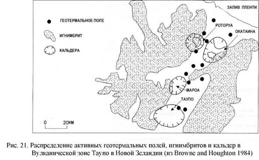 Эпитермальные месторождения лоу-сульфидейшн восходящего потока располагаются в кальдерах, но обычно в материале заполнения и реже в купольном комплексе. Аналогичные эпитермальные месторождения лоу-сульфидейшн восходящего потока располагаются в внешнекальдерных ближних фауиях. Они часто содержатся в структурных впадинах со аналогичными внитрикальдерными фациями заполнений кальдер, частично находятся в озерных отложениях, но они отсутствуют в очень мощных кристаллокластических игнимбритах, которые характерны для кальдерного заполнения. Там где рудная минерализация размещена в удаленных фациях, она является частью до гидротермальных вулканических образований. Это можно проиллюстрировать путём рассмотрения активных геотермальных полей, кальдер и широко распространенных игнимбритовых слоев в Вулканической зоне Таупо в Новой Зеландии (рис. 21). Хотя не все активные системы образуют рудные месторождения, но из этого следует, что гидротермальные месторождения не могут образоваться вне их. Поскольку лишь несколько систем образуются внутри кальдер, все располагаются в пределах 20 км кальдеры и возможно, что большее количество кальдер имеется в наличии чем определяется при исследовании.