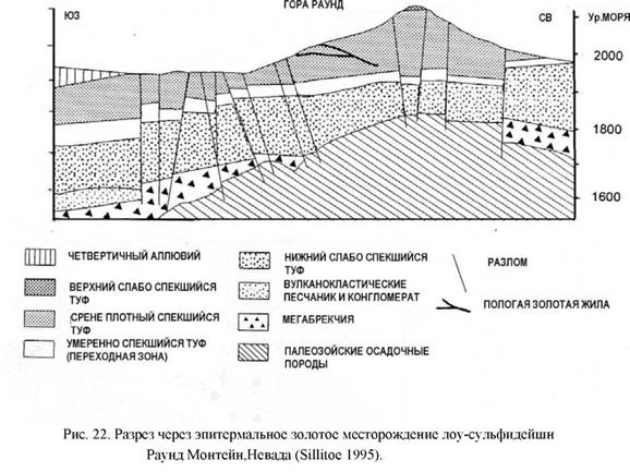 Примером месторождения, расположенного в материале кальдерного заполнения, является Раунд Монтейн в штате Невада в США, где вмещающая порода представлена мощными игнимбритами. Месторождение имеет сеть питающих эруптивных каналов, но большая часть повсеместно распространенной рудной минерализации находится в пористом богатом пемзою слое в мощных игнимбритах (рис. 22).