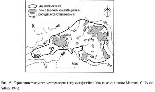 Эпитермальная золотая минерализация была изучена в риолитовом куполе на Слипер (Невада), но имелась ли взаимосвязь с кальдерой неясно (Sillitoe 1995). Многие эпитермальные месторождения Боливии размещены в куполах, сложенных кислыми породами и, по крайней мере, некоторые из них связаны с кальдерами (Cunninghametal. 1991). Эти месторождения включают, как типы лоу-сульфидейшн, так и хай сульфидейшн и к ним относится месторождение Черро Рико де Потоси, самое большое из известных серебряных месторождений. Основанная рудная минерализация во вне кальдерных ближних фациях изучена на Макдоналд (штат Монтана), где аналогичная структура рудной минерализации, что и на Раунд Монтейн с вертикальными дренирующими зонами и ровно лежащими рудоносными пемзовыми слоями. Карта представлена на рис. 25.