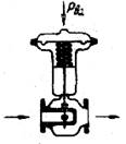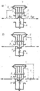 При регулировании давления р01 перед регулятором /рис. 2,а /импульсная линия 6 соединяет точку регулируемого давления с подмембранной зоной. Клапан 1 устанавливается сверху (со стороны сильфона 3 ). При отсутствии движения воды в трубопроводе регулирующий клапан 1 под действием пружины 4 будет находиться в закрытом состоянии («нормально закрыт»). При движении воды давление р01 до регулятора выше давления р02 после регулятора. Сильфон 3 разгружает клапан 1 от давления р02 . Давление р01 ,действуя на клапан снизу, создает усилие, поднимающее клапан, этому противодействует усилие растянутой пружины 4. Кроме того, сверху на клапан через шток 7 действует усилие, создаваемое мембраной 5 . Если давление до регулятора становится ниже установленной величины, то мембрана 5 опускаетсявниз, прижимаяклапан 1 к седлу 2, уменьшая сток до тех пор, пока не восстановится равновесие сил. При увеличении давления до регулятора мембрана 5 поднимается вверх, усилие, создаваемое мембраной, становится больше силы упругости пружины и клапан с помощью штока 7 поднимается вверх, увеличивая сток воды. Давление р01 снижается до заданной величины.