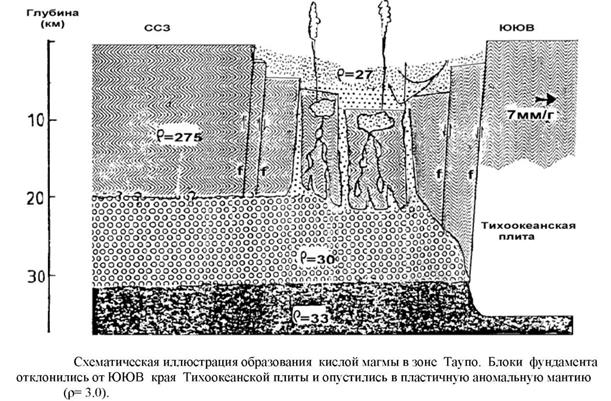 2. Риолиты. Риолиты, развитые в орогенных поясах, в большинстве случаев имеют различное происхождение в отличие от андезитов и, во многих случаях, их образование и риолитов полностью не совпадает. Следует отметить, что незначительное количество кислых пород может образоваться за счёт более основной магмы. Типичный случай образования риолита в вулканической зоне Таупа в Новой Зеландии показан на рис. 2.3.
