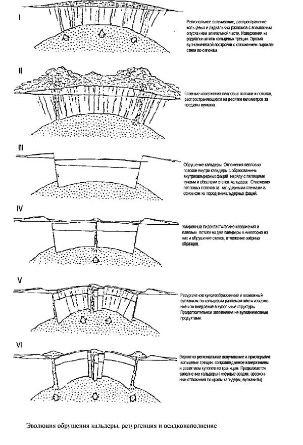 попытка показать некоторые базовые положения и характеристики вулканических структур. Полнокровное обсуждение физического вулканизма и его продуктов можно найти в полевых описаниях, подготовленных Брусом Хоугтоном, и в полевых исследованиях фондов земных ресурсов. На рис. 2.4 показана эволюция обрушения кальдеры резургенции и связанных с этим отложений.
