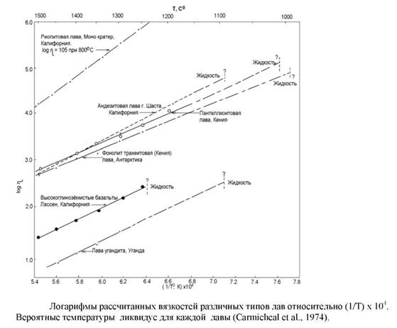 Рис. 2.5 показывает влияние температуры на вязкость магмы, которая играет важную роль в природе магматических извержений. Магматическая вязкость, как видно из диаграммы, может изменяться при остывании до двух порядков. После кристаллизации первых твёрдых фаз вязкость возрастает по мере уменьшения температуры. Это имеет отношение к типу потока и расстоянию, на которое он удаляется.