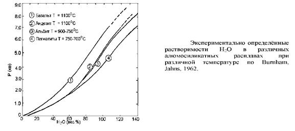 Растворимость как Н2О, так и СО2 находится в строгой зависимости от давления, но Н2О более растворимо в кислых расплавах, а СО2, H2S и SO2 в базальтовых расплавах. Зависимость растворимости Н2О от давления показана на рис. 2.6.