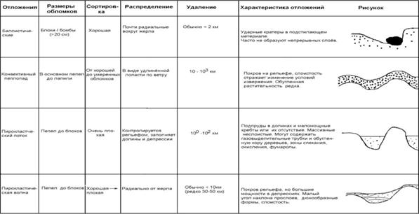 Отложения пирокластических потоков могут быть следствием нескольких процессов. Наиболее важные включают обрушение эруптивной колонны, наклонные эруптивные колонны ударных волн, или пассивное, не взрывные обрушения лавовых потоков или куполов. Маленькие потоки обычно связаны с обрушением куполов или частичным обрушением эруптивных колонн, в то время как большие потоки обычно приводят к крупным извержениям силикатной магмы и в результате чего, насыщенной пемзой. Разновидности пирокластических потоков показаны в табл. 2.4