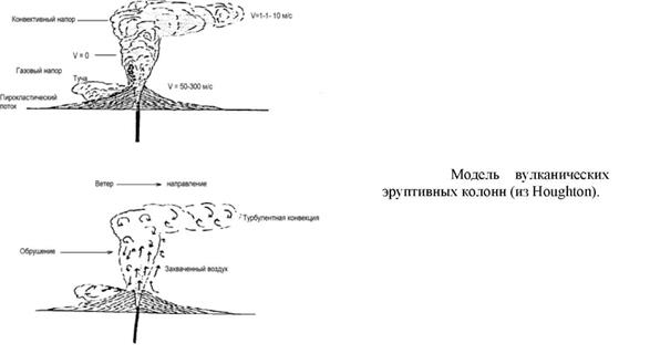 Извержения для удобства можно разделить на экструзивные и эксплозивные. Схема показана на рис. 2.3. Оба типа извержений могут проявляться на одном и том же вулкане. Экструзивные извержения характеризуются магмой, малонасыщенной летучими, в которой вязкость ограничена выделением последних, что приводит к выбросу жидких магм на поверхности. Эксплозивные извержения - это быстро дегазирующая магма сопровождается интенсивным разрушением как магмы, так и вмещающих пород.