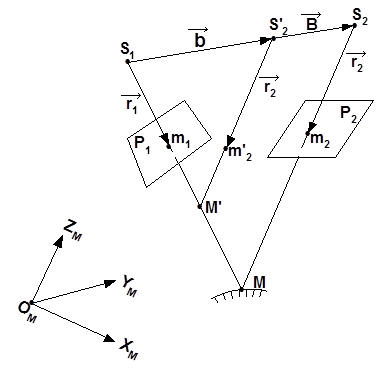 На рис.1 показана стереопара снимков Р1 и Р2, на которых точка местности М изобразилась соответственно в точках m1 и m2 . Будем считать, что элементы внутреннего и внешнего ориентирования снимков известны.