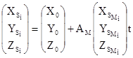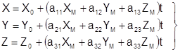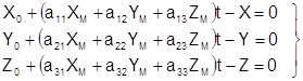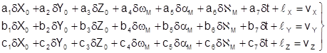 Значения коэффициентов уравнений поправок ai , bi , ci вычисляют по известным значениям координат ХМ ,YM ,ZM и X, Y, Z и приближенным значениям неизвестных. Значения свободных членов ℓX , ℓY , ℓZ вычисляют таким же образом по формулам ( .1).