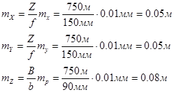 В качестве примера вычислим величины mX , mY и mZ точек местности, определенных по стереопаре снимков масштаба 1:5000, полученной АФА с f =150 мм и форматом кадра 23х23 см, с продольным перекрытием 60%.