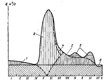 1 — глубокое подземное питание, 2 — верховое подземное питание, 3 — снеговое половодье. 4 — отдача поймы, 5 — дождевые паводки, 6 — потери стока воды на образование льда