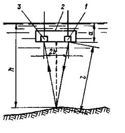 Действие эхолота основано на принципе измерения времени прохождения ультразвуковой волны от вибратора-излучателя 1 (рис. 2.4) до дна и отраженной волны обратно до вибратора-приемника 3. Из рис. 2.4 следует, что