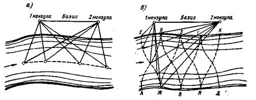 При промерах по продольникам (рис. 2.6 а) на базисе устанавливают два угломерных инструмента (мензулы с кипрегелями, теодолиты и т.п.). Лодка (катер) перемещается по течению примерно параллельно береговой линии. В момент измерения глубины по сигналу с лодки засекается положение промерной вертикали одновременно двумя инструментами. Продольники назначаются обычно через 1/10-1/20 ширины реки, у берега чаще, чем в средней части реки.