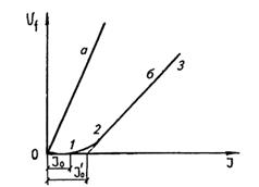 где J'0 — начальный градиент напора, т.е. участок на оси J, отсекающий продолжение отрезка прямой 2—3 до пересечения с этой осью. Для песчаных грунтов фильтрация начинается сразу после передачи напора (кривая а).