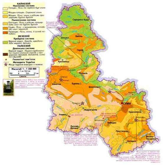У цілому формування осадових порід на Сумщині відбувалося в умовах платформ енного режиму на фоні чітко виражених пульсуючих рухів. Водночас цікаво те, що між північними та південними ділянками Сумської області є суттєві відмінності як у повноті геологічних розрізів, так і в їх потужності. Зокрема, розрізи у південній частині області зазвичай є більш повними й потужними. А для північних районів, навпаки, типовим є випадання із розрізів цілого ряду товщ та горизонтів за різкого скорочення потужностей усіх стратиграфічних підрозділів.