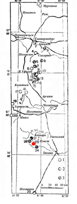 3 – д. Колюткино; 4 – Сысертское; 5 – Соколиный камень; 6 – Абрамовское; 7 – Черкаскульское; 8 – Иткульское; 9 – Тюбукское; 10 – Аллакское; 11 – Кисегачское; 12 – Каслинское; 13 – М-Каслинское; 14 – Голодное; 15 – Красное; 16 – Теченское; 17 – Увильды; 18 –Уфимское; 19 – Таганайское; 20 - Уреньгинское; 21 – Михайловское; 22 – Светлинское; 23 – Борисовское ; 24 – Каменское; 25 Карталинское