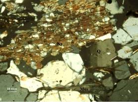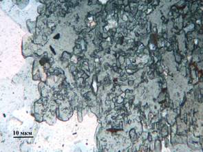 Определенные трудности возникали при петрографическом исследовании слюдистых минералов, которые представлены мелкопластинчатыми, чешуйчатыми зернами. Отмечалось замещение агрегатных чешуек биотита мусковитом и последующая хлоритизация того и другого минерала. Сложность состояла еще в том, что все эти минералы бледно-окрашенные и в шлифах почти бесцветны.
