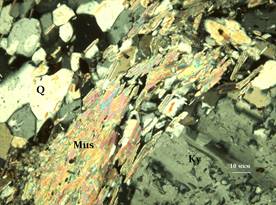 Взаимоотношение минералов кианита и кварца в мусковит-кианитовых сланцах указывает на совместное образование минералов.