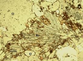 Кианитовые кварциты обладают массивной текстурой, нематогранобластовой и порфиробластовой структурами.
