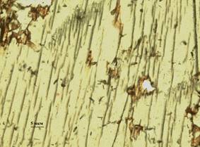 Мусковит-кианитовый сланец (шлиф № Б5) – порода красно-бурого цвета, равномерная окраска обусловленная развитием гематита по всей породе. Текстура породы сланцеватая благодаря ориентированным кристаллам кианита. Внешне структура породы порфиробластовая, обусловленная крупными зернами кианита.
