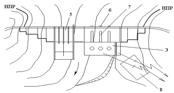 Рис.2. Компоновка споруд гідровузла: а) варіант з греблею із місцевих матеріалів; б) варіант з бетонною греблею; 1 – земляна гребля; 2 – бетонна гребля; 3 – будівля ГЕС; 4 – експлуатаційний тунельний водоскид; 5 – водозливна гребля; 6 – водоприймач; 7 – турбінні трубопроводи ГЕС; 8 – ВРП