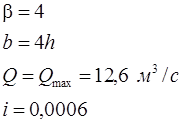 Определение размеров поперечного сечения сводится к определению ширины по дну и глубины наполнения по заданным параметрам (расход Q, уклон i , коэффициенты шероховатости n и заложения откосов m). При расчетах используется рациональное соотношение β между шириной канала по дну и глубиной наполнения.