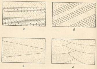В зависимости от условий накопления пластов, различают слоистость горизонтальную, характерную для морских отложений; косую, характерную для речных отложений; диагональную и перекрестную, характерную для эоловых образований (рис. 1). Однако существуют и такие осадочные породы, в которых слоистость не наблюдается (например, в химических и органогенных отложениях).