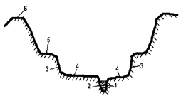 Рис.1. Поперечний переріз долини: 1 - русло; 2 і 3 - руслові і корінні береги; 4 - заплава; 5 - надзаплавна тераса; 6 - вододіл