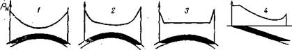 Закономерности изменения свойств нефти и газа по объему залежи. Полное единообразие свойств нефти и растворенного в ней газа в пределах одной залежи — довольно редкое явление. Для нефтяных залежей обычно изменения свойств достаточно закономерны и проявляются прежде всего в увеличении плотности, в том числе оптической плотности, вязкости, содержания асфальто-смолистых веществ, парафина и серы по мере возрастания глубины залегания пласта, т. е. от свода к крыльям и от кровли к подошве в мощных пластах. Фактическое изменение плотности в пределах большинства залежей обычно не превышает 0,05-0,07 г/см3 . Однако очень часто градиент нарастания плотности и ее абсолютные значения резко возрастаютв непосредственной близости к водонефтяному контакту (ВНК, рис. 1,1, 2), где могут встречаться полутвердые асфальты и твердые битумы. Иногда эти малоподвижные нефтяные вещества образуют монолитный слой в подошве залежи, который полностью или частично запечатывает залежь, изолируя ее от законтурной водоносной зоны. Нередко плотность нефти выше изолирующего слоя практически постоянна (рис. 1,3). В залежах «открытого» типа, приуроченных к пластам, выходящим на дневную поверхность, и запечатанных с головыасфальто-кировыми породами, плотность нефти с увеличением глубины уменьшается, достигает минимума, а затем увеличивается по мере приближения к ВНК (рис. 1,4).