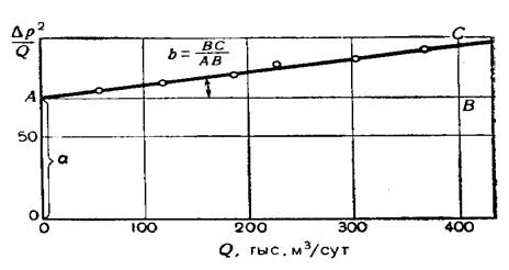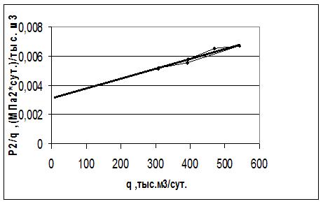 Проведем обработку результатов исследования, построив зависимость ΔР2 /q от q, и с помощью индикаторной кривой определим коэффициенты фильтрационного сопротивления А и В.