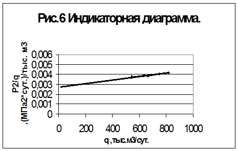 По данным, приведенным в таблице №7.2., была построена индикаторная кривая (Рис. 6). Отрезок отсекаемый этой кривой на оси ординат равен коэффициенту фильтрационного сопротивления А, а коэффициент В как тангенс угла наклона прямой к оси. Из рис. 6 можно примерно определить, что А=0,0027и В=0,00000163.